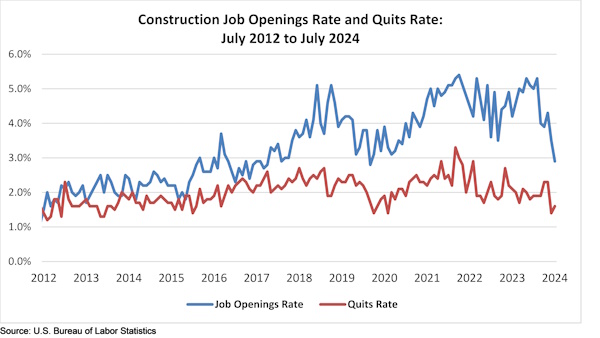 WASHINGTON, Sept. 4—The construction industry had 248,000 job openings on the last day of July, according to an Associated Builders and Contractors analysis of data from the U.S. Bureau of Labor Statistics’ Job Openings and Labor Turnover Survey. JOLTS defines a job opening as any unfilled position for which an employer is actively recruiting. Industry job openings decreased by 51,000 last month and are down by 103,000 from the same time last year.